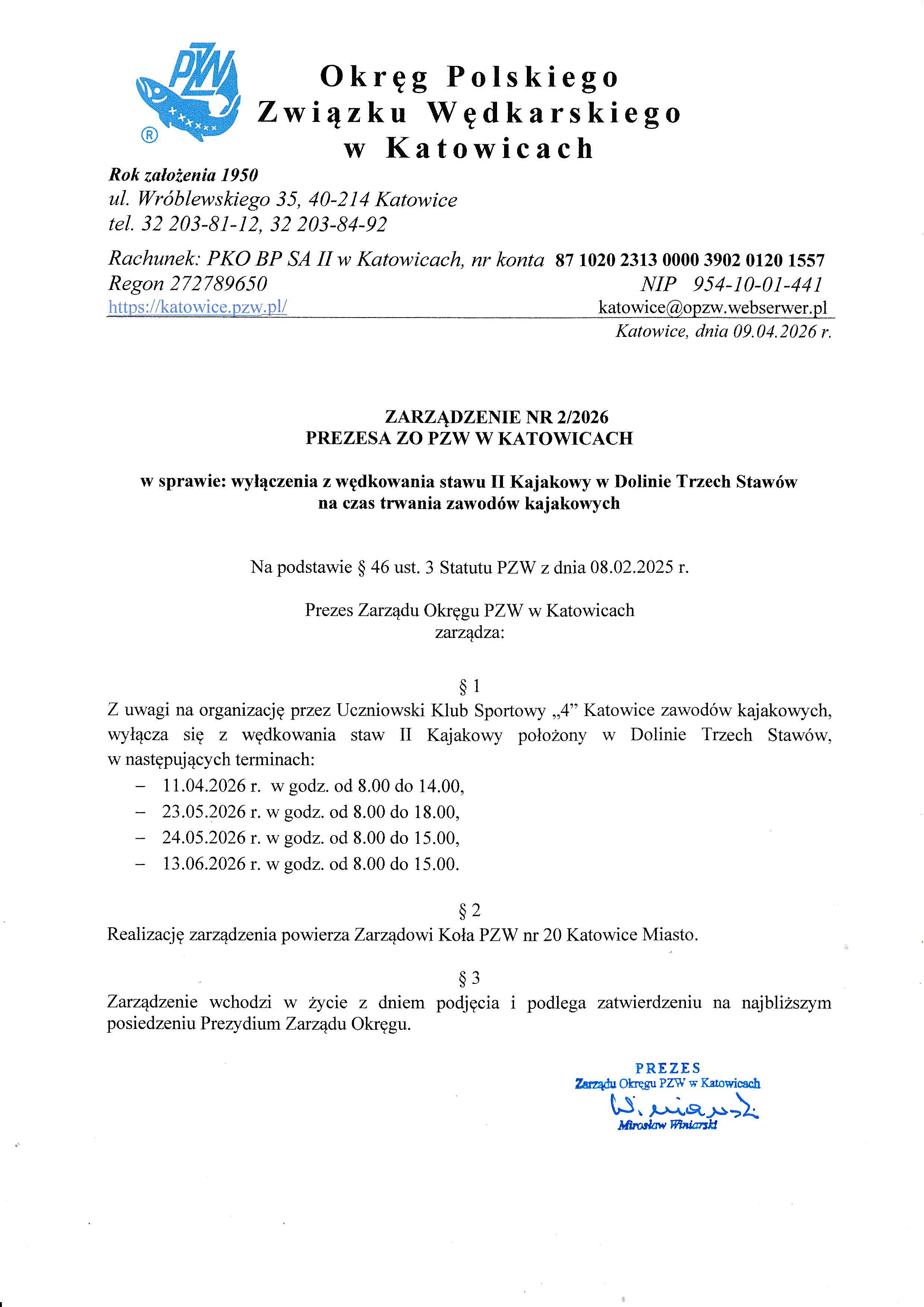 Wyłączenie z wędkowania stawu II Kajakowy w Dolinie Trzech Stawów na czas trwania zawodów kajakowych